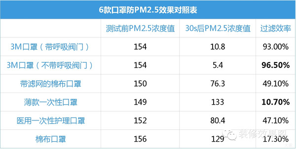 不帶呼吸閥門3M口罩的過濾效果最好,PM2.5過濾率可達(dá)96.5%;